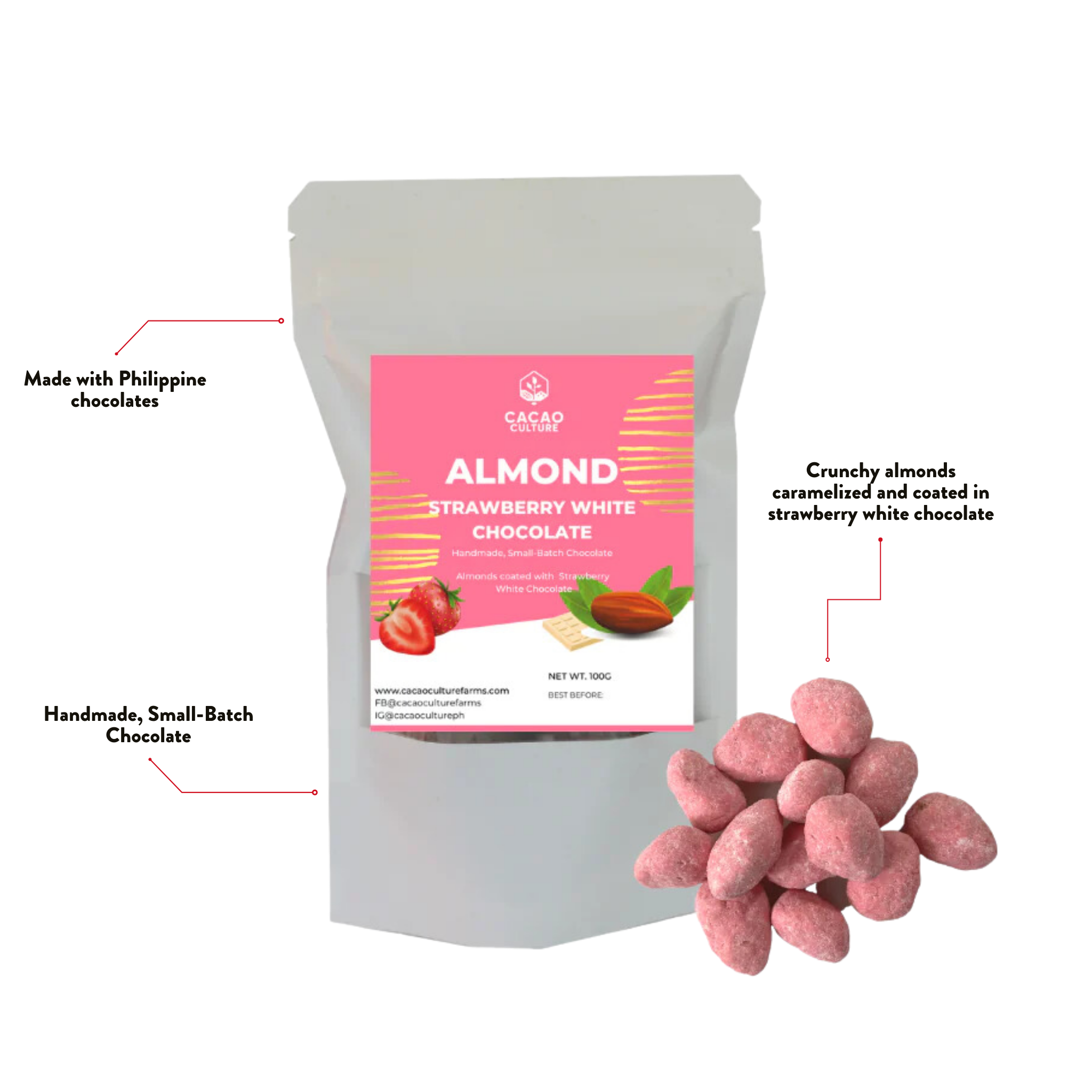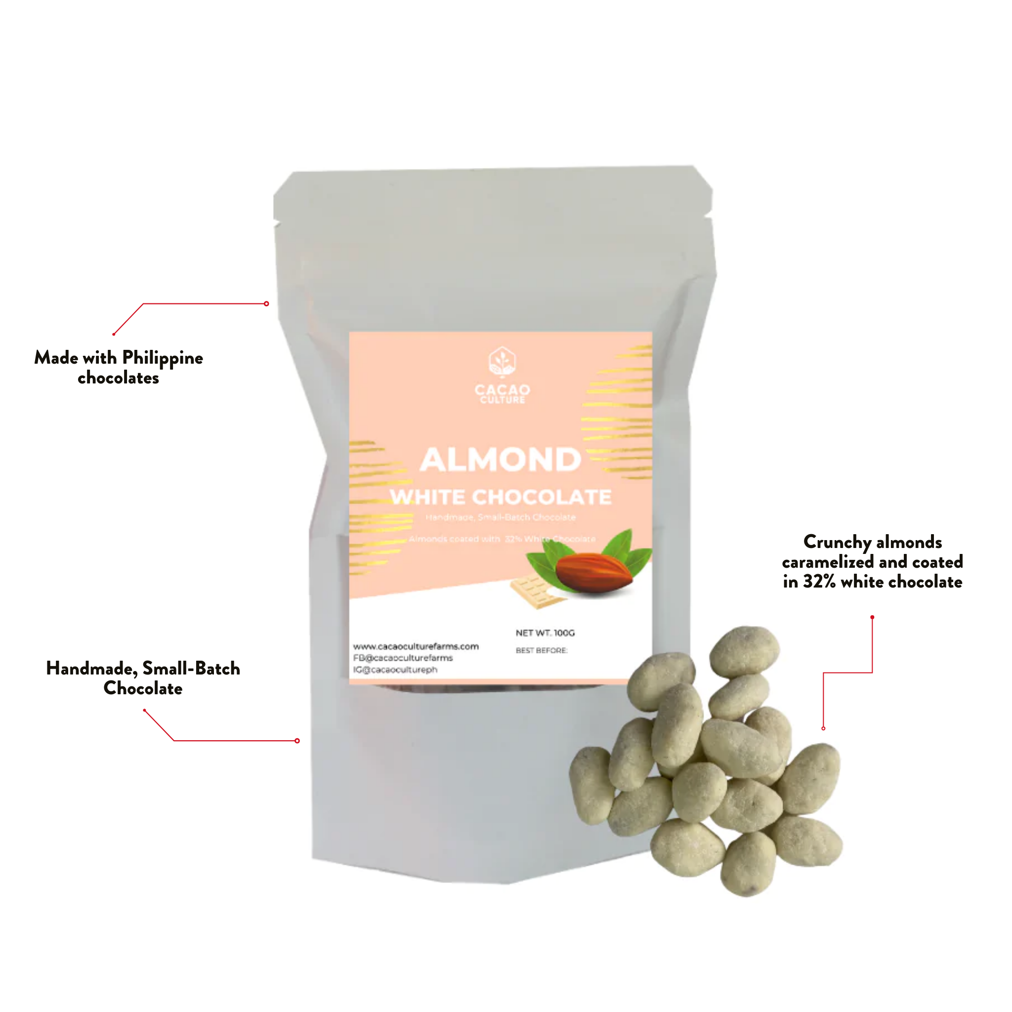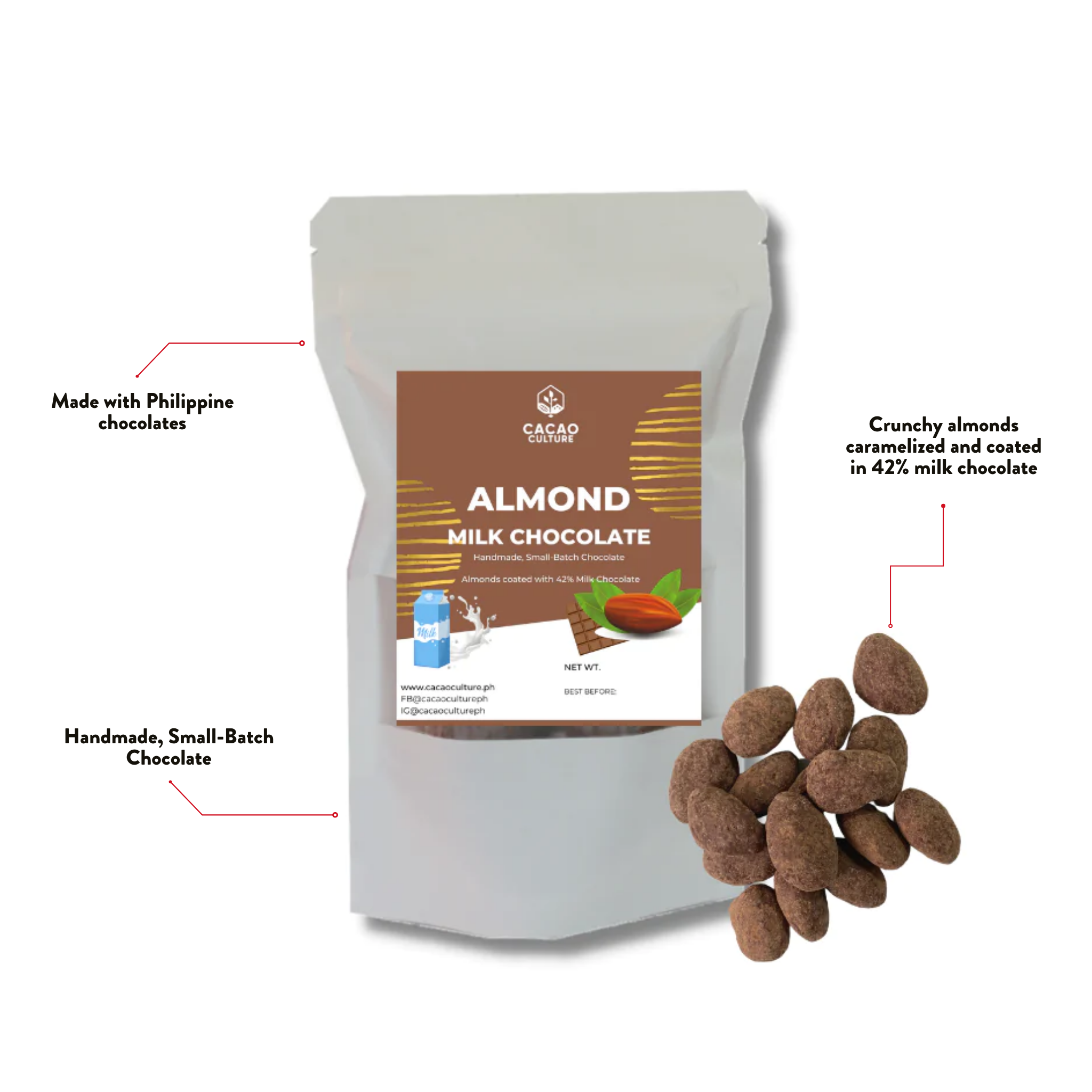 Indulge in the decadent taste of Cacao Culture’s Almond Covered Chocolates, hand-panned with premium Philippine chocolates. These crunchy almonds are first caramelized to perfection and then coated with chocolate flavors. Share this delectable treat with your friends or family, or keep it all for yourself – either way, it is an experience you won't want to miss!
