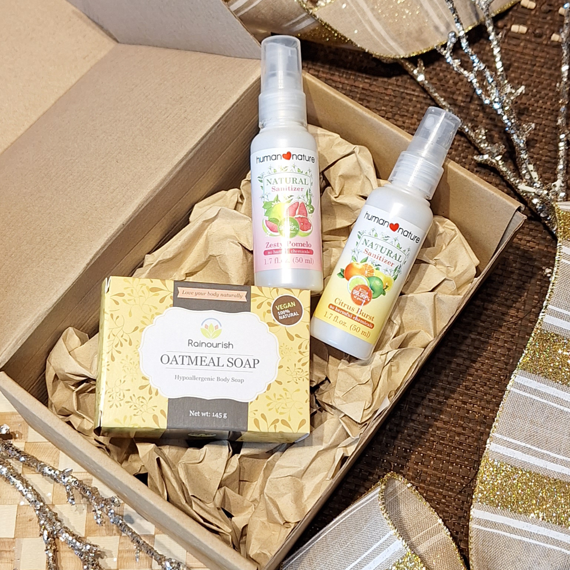 Stay safe and germ-free with this handy set containing an oatmeal soap and a 2 hand sanitizer spray2.