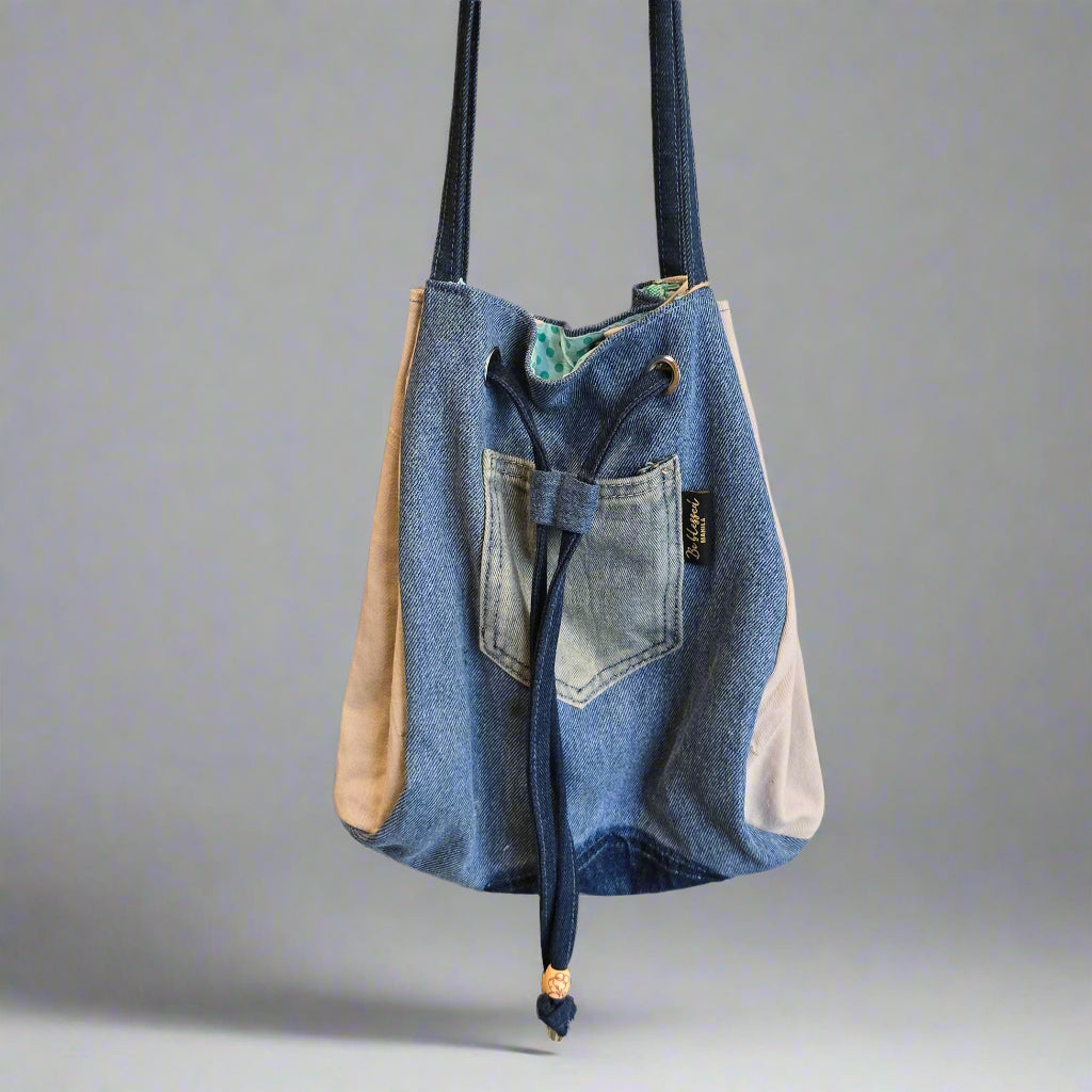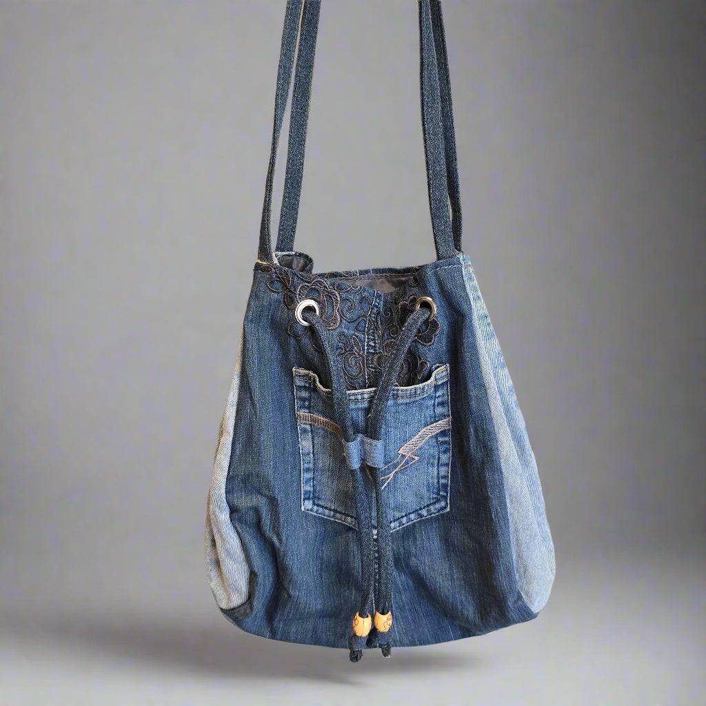 This bag is crafted from upcycled denim jeans, thoughtfully transformed into a unique and fashionable accessory.