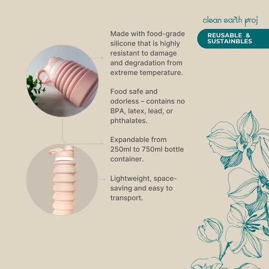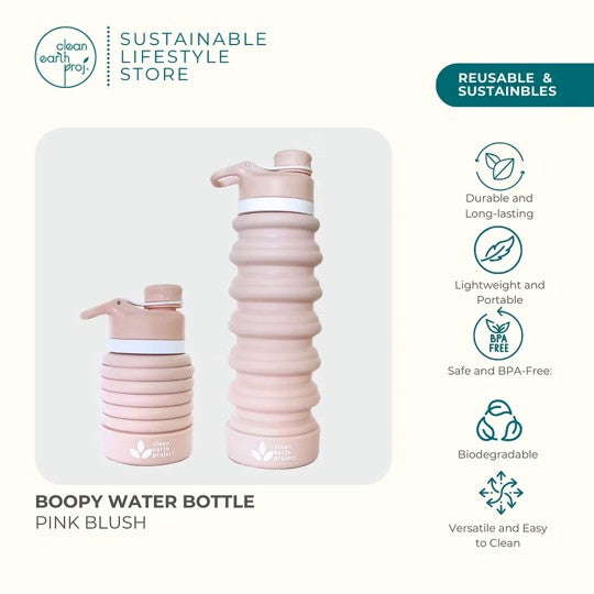 Meet the Clean Earth Project Boopy Collapsible Water Bottle. Your eco-friendly hydration companion for a life on the go. Crafted from food-grade silicone, this lightweight and portable bottle is perfect for travel, marathons, sports, and fitness routines. With a generous 750ml capacity, it keeps you hydrated while reducing single-use plastic waste.