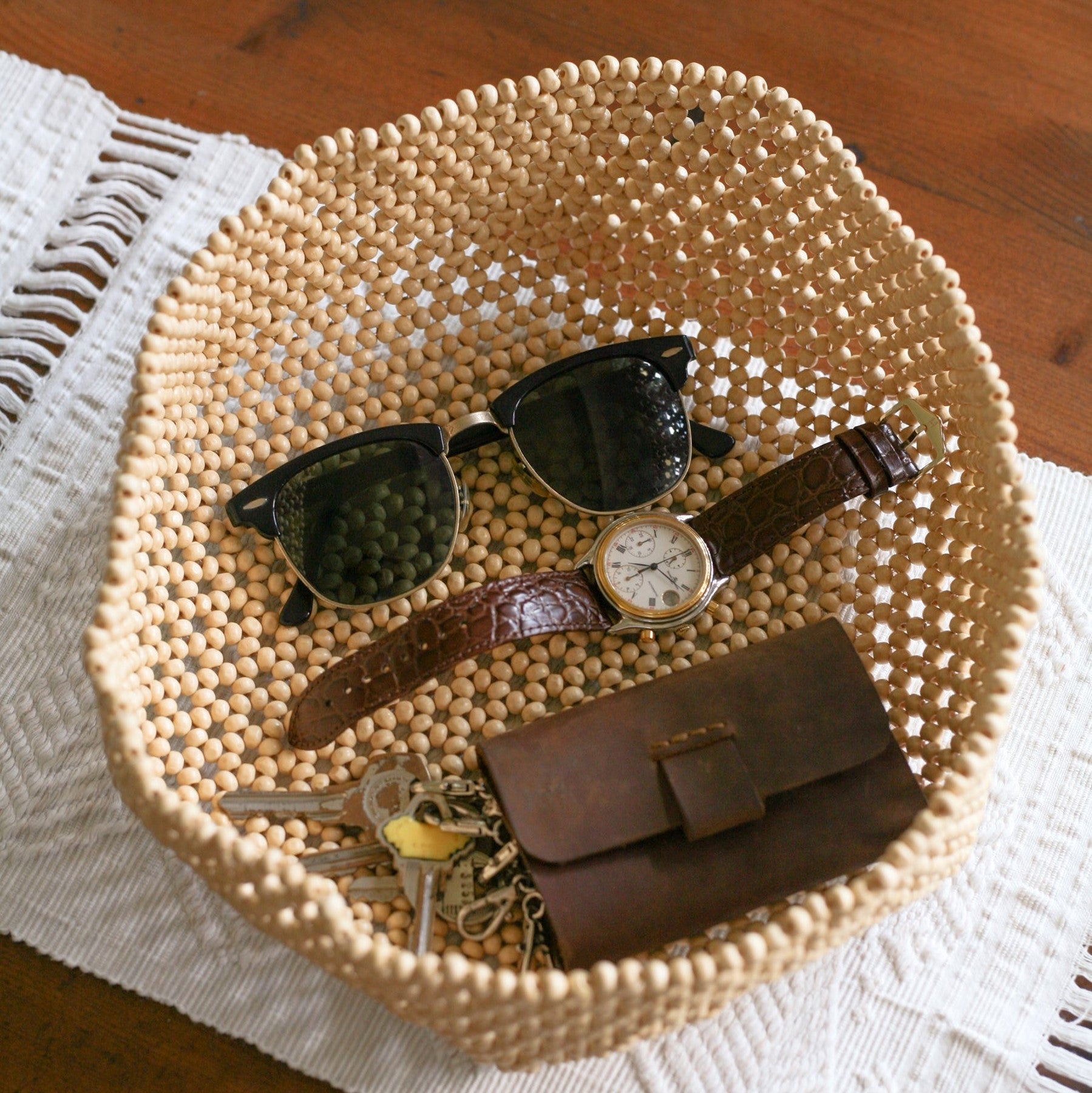 Organize in style with Habi's multipurpose accessory trays that also showcases traditional Filipino craftsmanship. Made with natural wooden beads and woven, it is perfect for organizing your belongings while adding a touch of elegance to your living space.