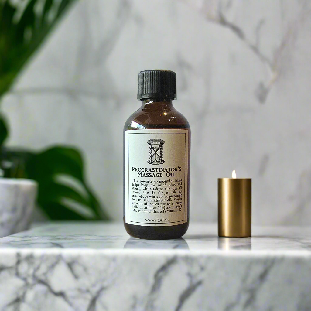 Procrastinator's Massage Oil - This tingly massage oil will keep your body relaxed and your mind clear. Rosemary and peppermint essential oils are grounding, clarifying, and yet also stimulating. The virgin coconut oil base is in itself nourishing as well.